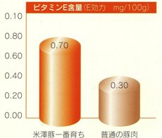 「米澤豚 一番育ち」はビタミンB1は牛乳の10倍、特にビタミンEに関しては普通の豚肉の2倍も含まれています。 飼育の段階で、特にビタミンEの強化を図っているため、美味しいさだけでなく栄養面でも充実した豚肉に仕上がっています。